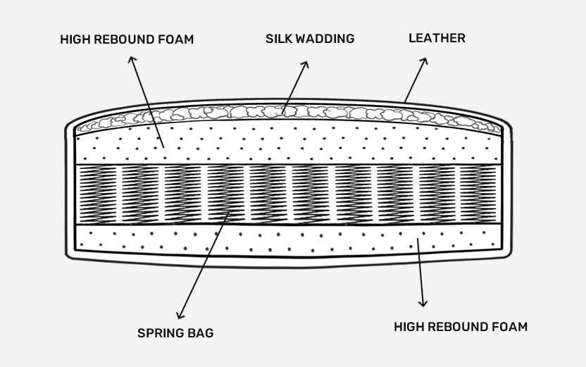 ● The seat cushions are ingeniously designed with a three-layer system: at the core, a spring bag provides responsive support, ensuring the cushions retain their shape and offer a subtle bounce. Encasing this is a layer of high-quality foam, offering a firm yet comfortable foundation. The outermost layer is leather, contouring to your body for a personalized and plush seating experience. This sophisticated combination guarantees a seat that's not just comfortable but also enduring, maintaining its welcoming embrace over time. Sit back and relax on a sofa that's been thoughtfully engineered for your ultimate comfort and enjoyment.