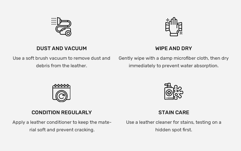 ● Dust and Vacuum: Use a soft brush attachment on a vacuum cleaner to gently remove dust, dirt, and debris from the surface and crevices of the leather.
