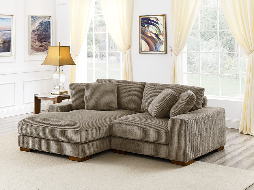 Experience comfort in small spaces with our 2 Modules Camel Brown Sofa with Chaise & Armrests. Crafted with soft corduroy fabric and high rebound foam cushions, this Modular Grey Couch offers both style and coziness. Perfect for compact living areas, it seamlessly fits into any corner or layout.