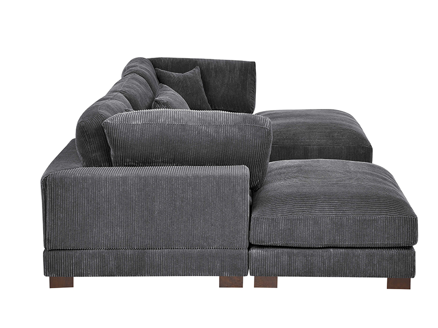This 5 Seat U Shaped Modular Couch in grey corduroy provides ample seating and flexibility with its spacious design. The sofa includes a matching ottoman and features a durable three-layer cushion system with pocket springs, ensuring lasting comfort and support. Eco-friendly and SGS certified, it's built to last up to 20 years, making it a stylish and practical choice for modern living spaces.